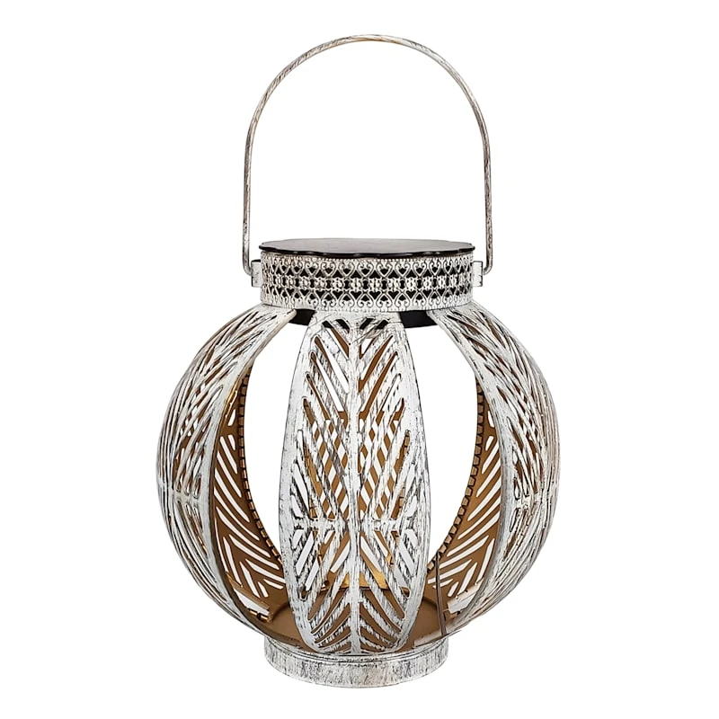 Our 6.5in. antique white global round shadow casting metal LED lantern features a unique open ball design that complements the LED candlelight inside. A realistic LED with gives the bulb a true shimmer for a light that warms any space, and the movable handle makes it easy to hang wherever you want some additional glow.