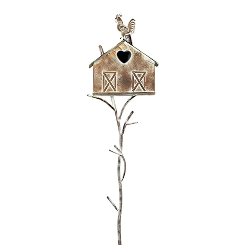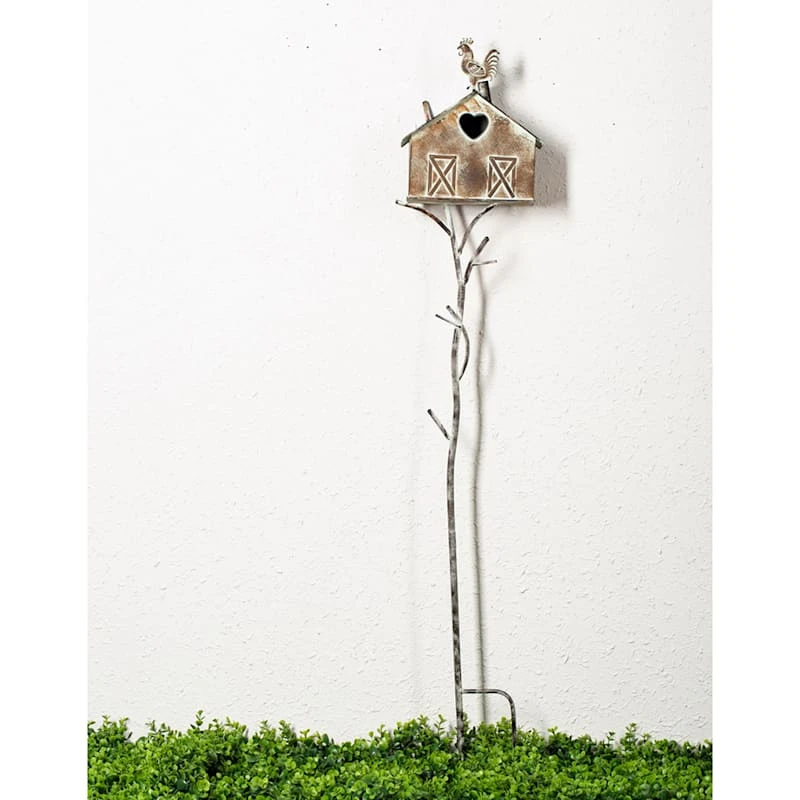 Add a pinch of fun to your garden with our rustic metal birdhouse garden stake. Created with love, this detailed metal decor features a branch-like base with a barn and rooster motif. Everyone will enjoy the charming birdhouse tucked into your prolific garden. Made of rust-resistant metal.