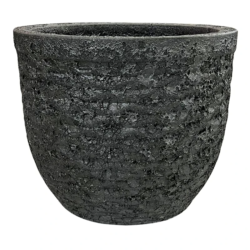 Highlight your green thumb and showcase your annuals and perennials at your front door or add a touch of festive foliage to the deck with our simple yet stylish planter. More than just a spot to display your gardening skills, this wonderful 12in. black Relic Egg planter offers a wonderful artistic appearance with its rustic textured black surface, dimpled waves and curved rimmed shape. Designed to live indoors or on a covered patio, this black ceramic pot is ready and waiting to make your plants pop.
