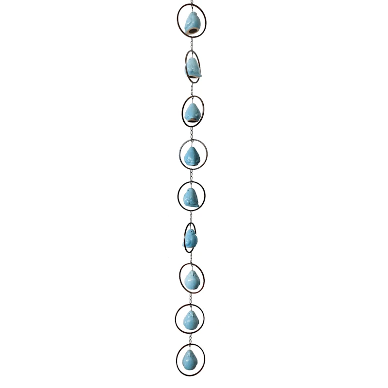 This is the cutest circle of feathered friends. Featuring a looped chain link design, wonderful blue ceramic birds adorn our tiered metal and ceramic wind chime, creating a clear and graceful sound. Wind chimes are symbolic of serenity and tranquility and are also thought to bring luck to whomever listens to them. The perfect gift for the outdoor lover.