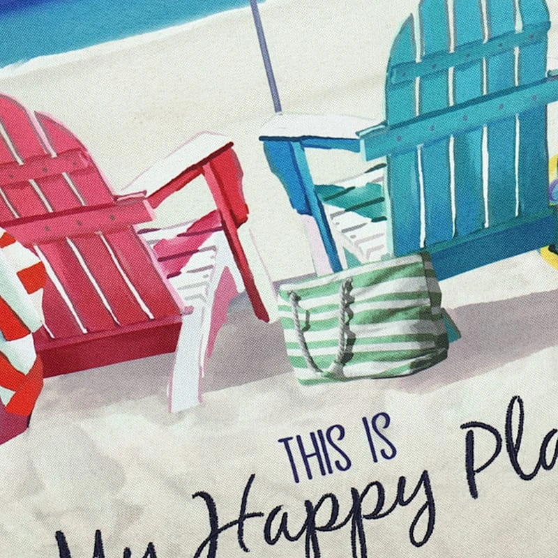Welcome visitors into your home with our fun “This is my happy place” beach scene garden flag. Featuring a colorful outdoor motif, this welcome sign is a great way to greet your guests. The wonderful multicolor Adirondack chair duo and umbrella detailing are a nice pop to help get the warm days ahead started. This is the perfect spring or summer decoration to welcome in the new season and guests, too.