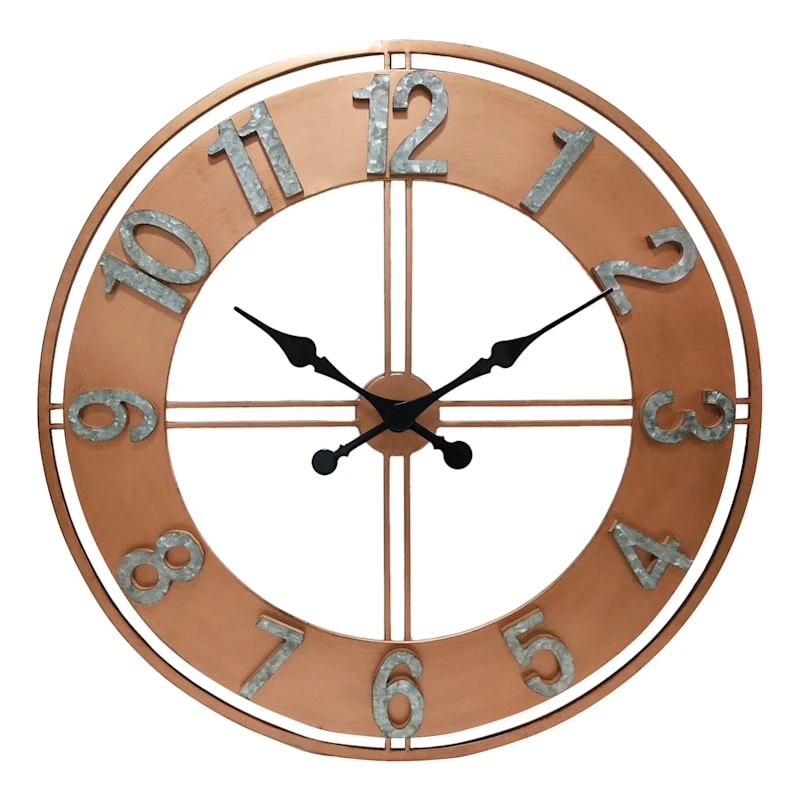 Full of simple charm, our 29in. copper colored artisanal iron wall clock combines modern reliability with timeless reliability. The copper, silver and black natural open design will look good anywhere, and the easy-to-read numerals pop to keep you on schedule!