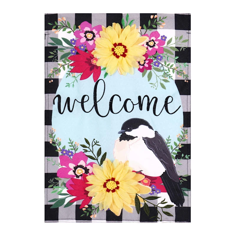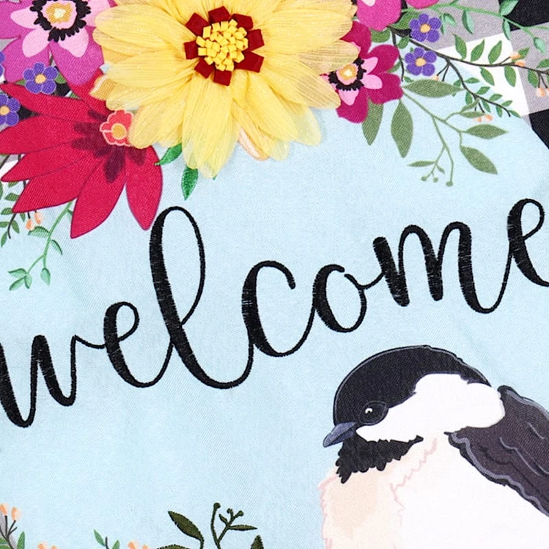 Welcome visitors into your home with our adorable farmhouse chickadee “Welcome” garden flag. Featuring a colorful outdoor motif, this welcome sign is a great way to greet your guests. The wonderful multicolor floral detailing and checkered details are a nice pop to help get the warm days ahead started. This is the perfect spring or summer decoration to welcome in the new season and guests, too.