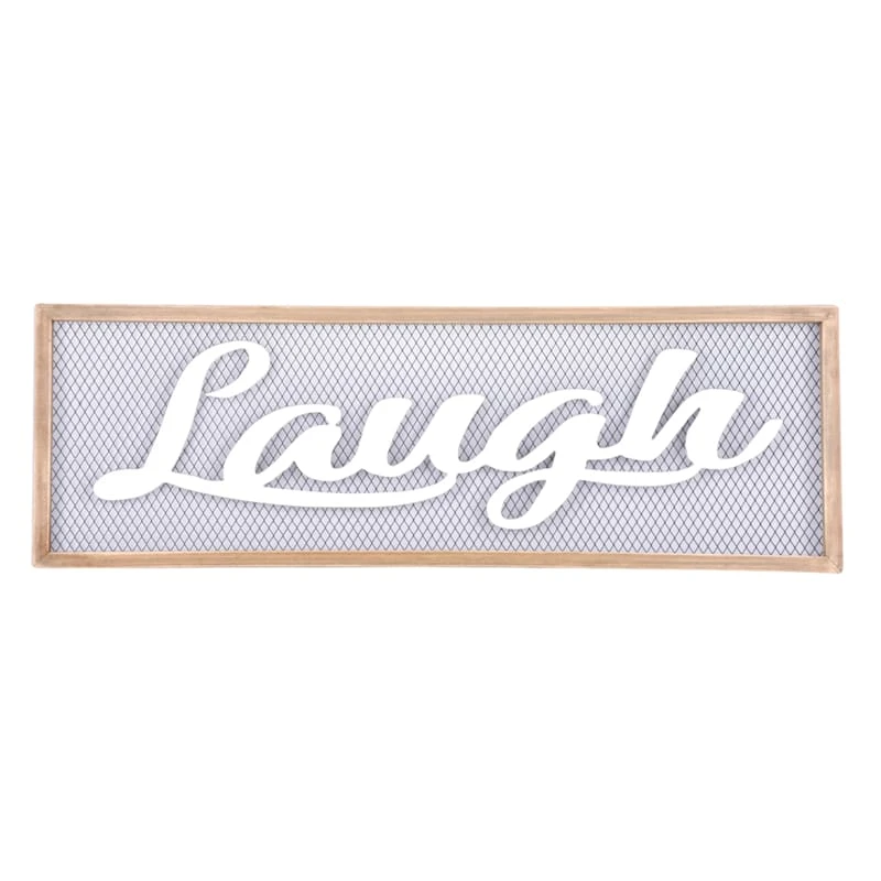 Our charming horizontal wood and wire sign features the message “Laugh{ carved and placed on a rustic chicken wire-look background. This wood and manufactured wood sign is finished in a natural and white hue that gives it authentic antique, old-world charm.