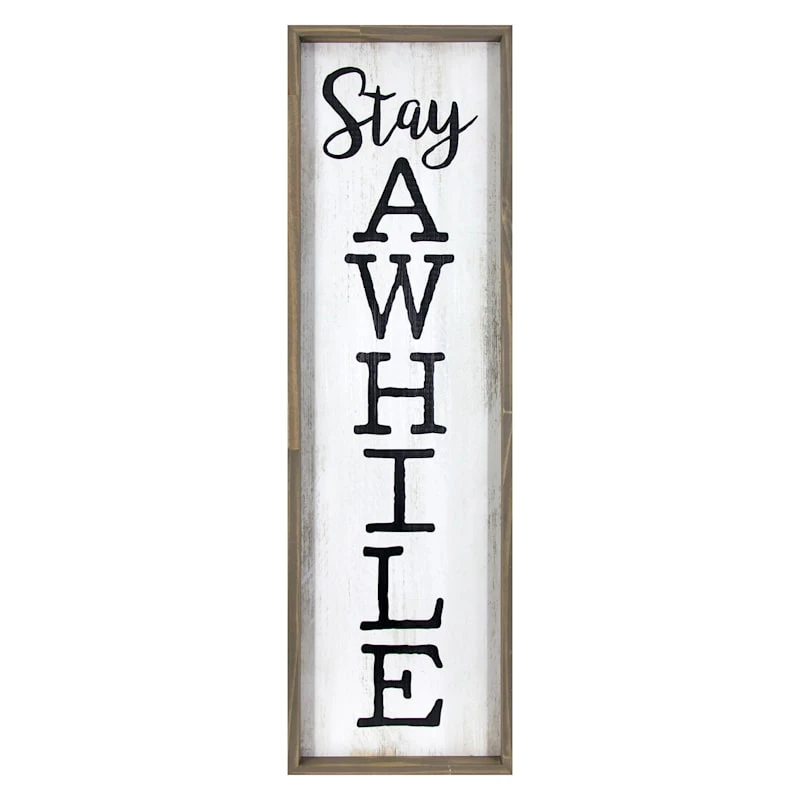 Add a pinch of fun to your garden with our 12x42in. framed âStay Awhileâ textured wooden garden wall sign. Created with love, this simple hued rustic sign features a welcoming message for all visitors. Everyone will enjoy the sweet message. Made of manufactured wood, this wall decor is designed to greet guests all season long.