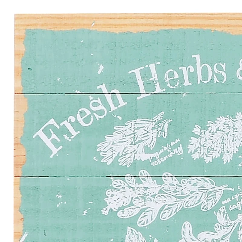 Add a pinch of fun to your garden with our 15in. âFresh Herbs & Dry Goodsâ wooden pallet garden wall sign. Created with love, this simple hued rustic sign features a charming motif for all visitors. Everyone will enjoy the sweet message. Made of painted wood, this wall decor is designed to greet guests all season long.