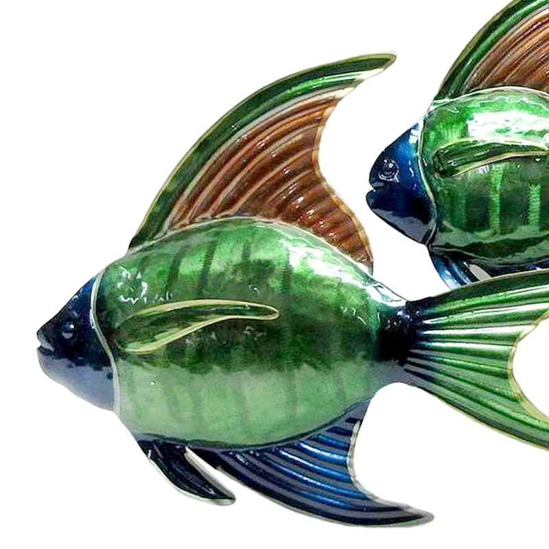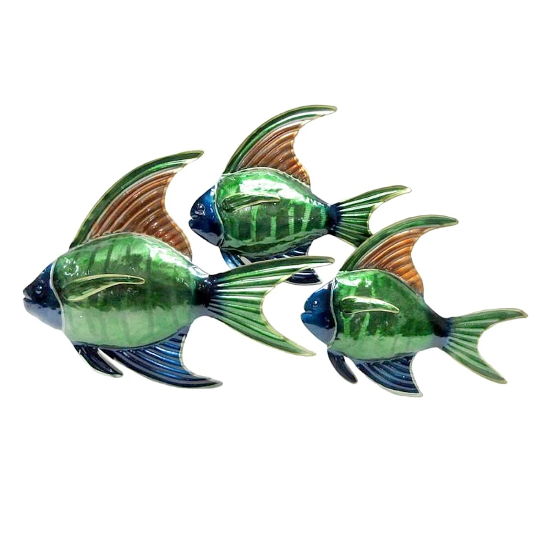 Add a pinch of fun to your garden with our 13in. green and blue metal fish wall decor. Created with love, this simple sign features a multicolor sea life school of fish motif. Everyone will enjoy the nice welcome. Made of rust-resistant metal, this wall decor is designed to greet guests all season long.