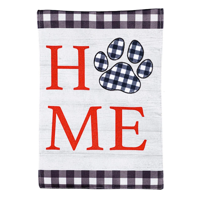 Welcome visitors to your home with our whimsical home dog paw garden flag. Featuring a black and white check and red print motif, this banner is the perfect spring or summer yard decoration.