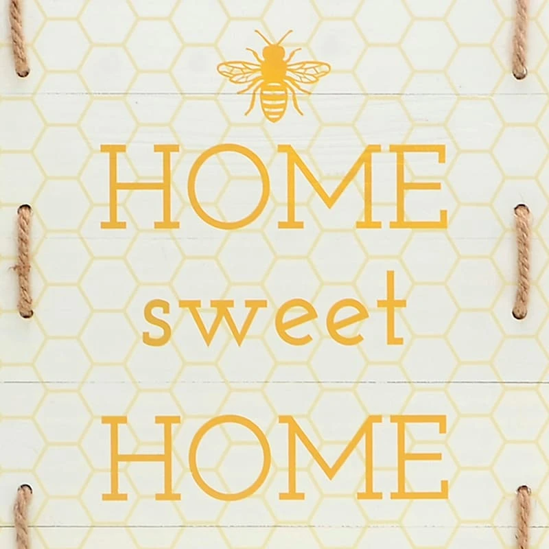 Modern farmhouse meets At Home prices in Honeybloom, our exclusive new brand that celebrates life lived together. Add a pinch of fun to your garden with our 12x15in. wooden “Home sweet Home” honey pallet wall sign. Created with love, this decorative wood wall plaque features a yellow and white bee and honeycomb message motif. Everyone will enjoy the wonderful welcome. Made of wood and rope, this wall art is designed to greet guests all season long.