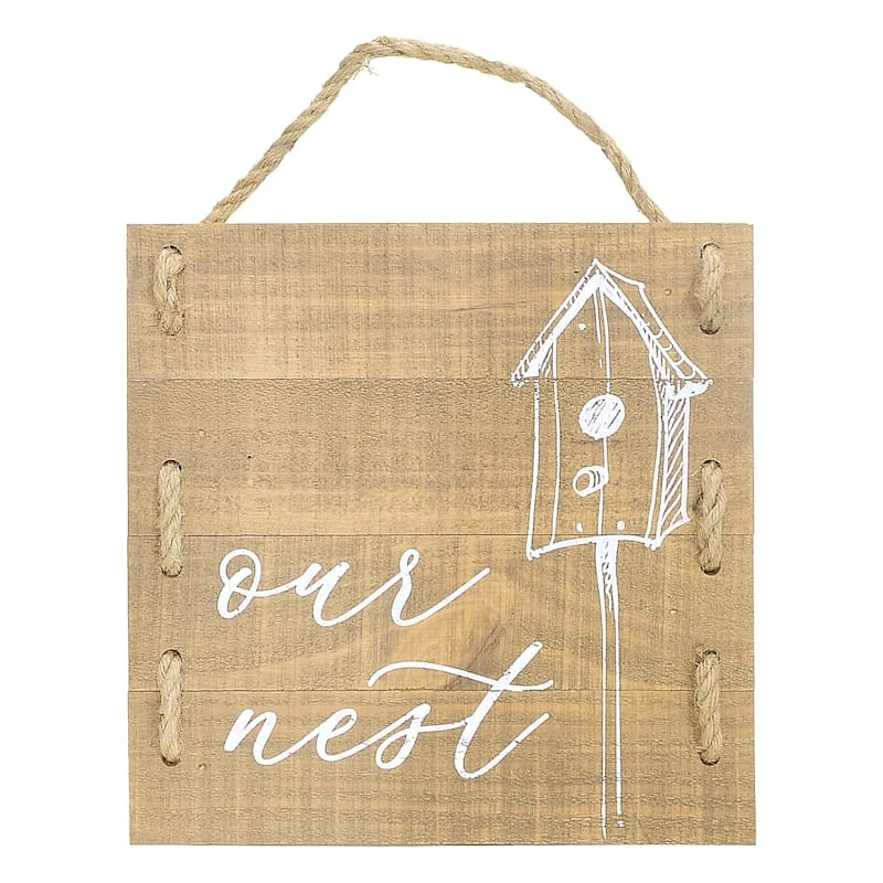 Modern farmhouse meets At Home prices in Honeybloom, our exclusive new brand that celebrates life lived together. Add a pinch of fun to your garden with our 12in. wood pallet “our nest” wall decor. Created with love, this decorative natural wood plank wall plaque features a white birdhouse and message motif. Everyone will enjoy the wonderful welcome. Made of wood and rope, this wall art is designed to greet guests all season long.