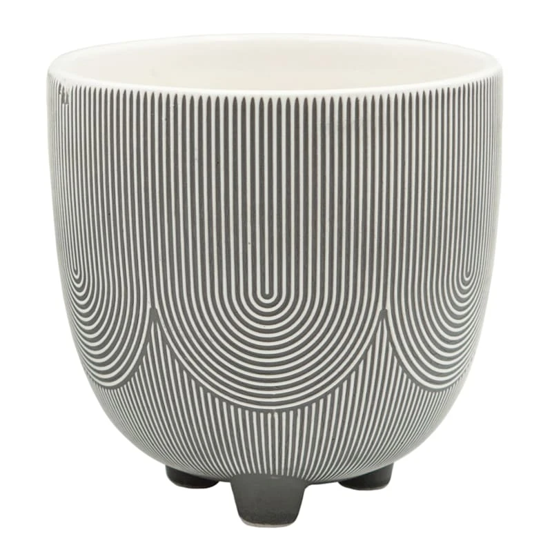 Highlight your green thumb and showcase your annuals and perennials at your front door or add a touch of festive foliage to the deck with our simple yet stylish ceramic planter. More than just a spot to display your gardening skills, this wonderful 5in. grey and white abstract lines ceramic pot offers a sleek contemporary appearance with its interesting ribbed abstract design, solid feet and curved shape. Designed to live indoors or on a covered patio, this ceramic planter is ready and waiting to make your plants pop.