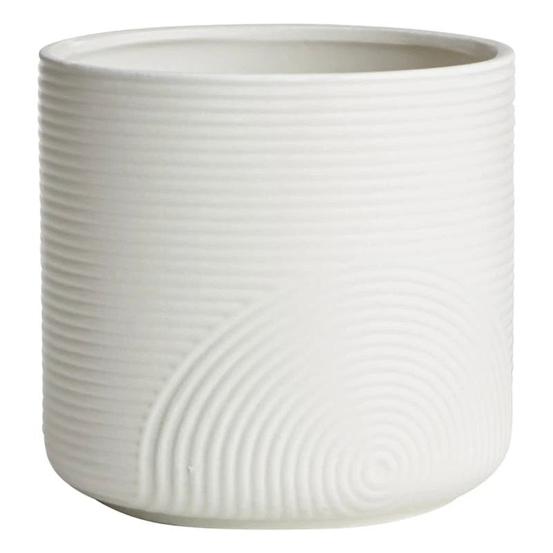 Highlight your green thumb and showcase your annuals and perennials at your front door or add a touch of festive foliage to the deck with our simple yet stylish ceramic planter. More than just a spot to display your gardening skills, this wonderful 5in. white modern lines ceramic pot offers a sleek contemporary appearance with its interesting ribbed stripe and circular design and cylindrical shape. Designed to live indoors or on a covered patio, this ceramic planter is ready and waiting to make your plants pop.