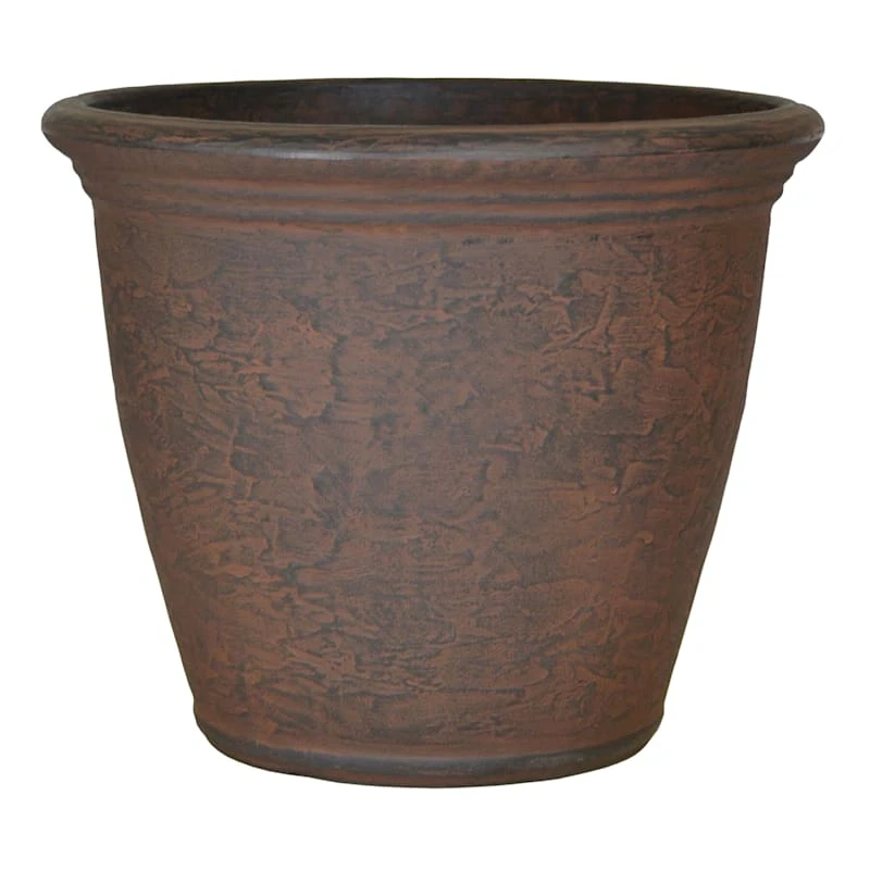 Our Kiri round decorative planter has a weathered Mediterranean look that resembles antique pottery. The plastic construction will be perfect on the patio, offering resilience and resistance to extreme weather conditions. The simple design and traditional silhouette of this 12.5in. rust brown decorative pot will showcase your favorite flowers or precious plants beautifully.