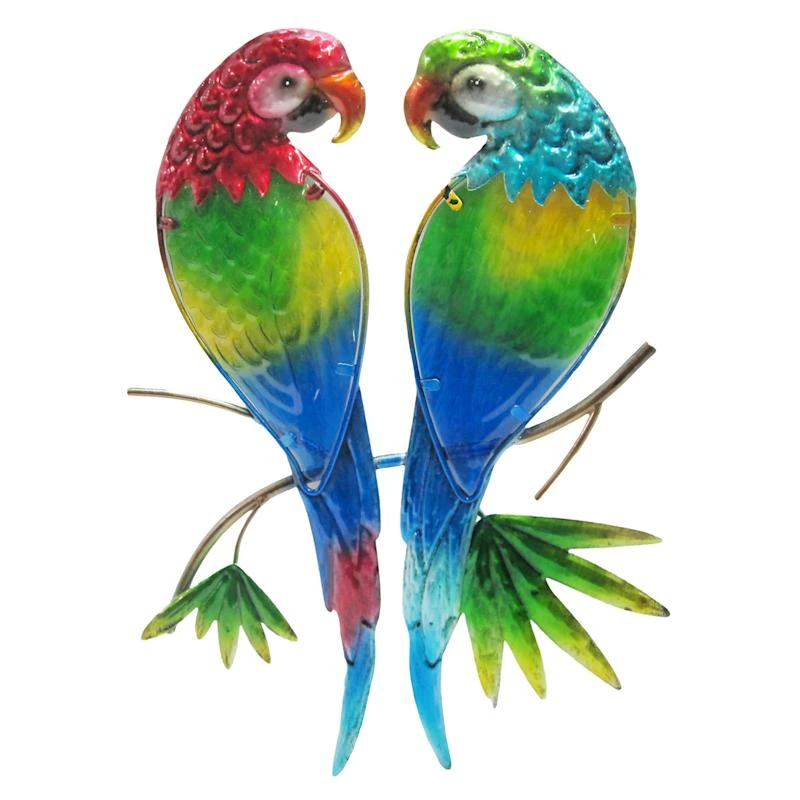 Delight any wall with our colorful metal and glass parrot wall plaque. Wonderful primary hues accented with fun design show off the intricate detail of the birds that almost seem to form a heart shape. Add a splash of summer to your outdoor space with these lovely parrots. Create a wonderful focal point on your exterior walls to add even more personality with this amazing wall decor piece. The wonderful parrot design will look stunning hung anywhere in your home, inside or out.