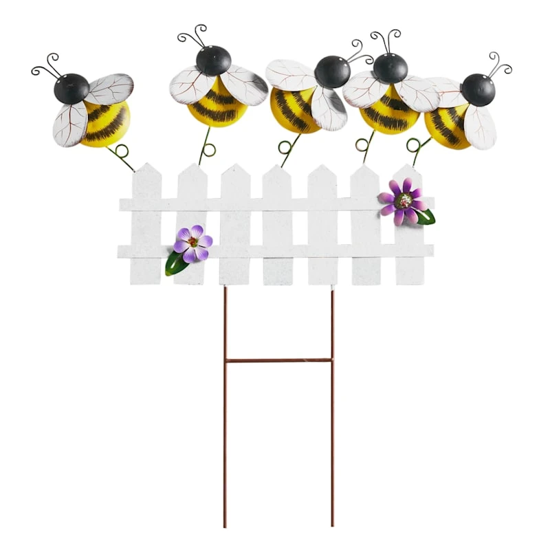 Add a touch of whimsy to your yard with our fun and colorful bee garden stake. Created with love, this detailed metal decor features an H-stake with a bees, fence and flowers motif. Everyone will enjoy the charming bumblebees frolicking in your prolific garden. Made of rust-resistant metal.