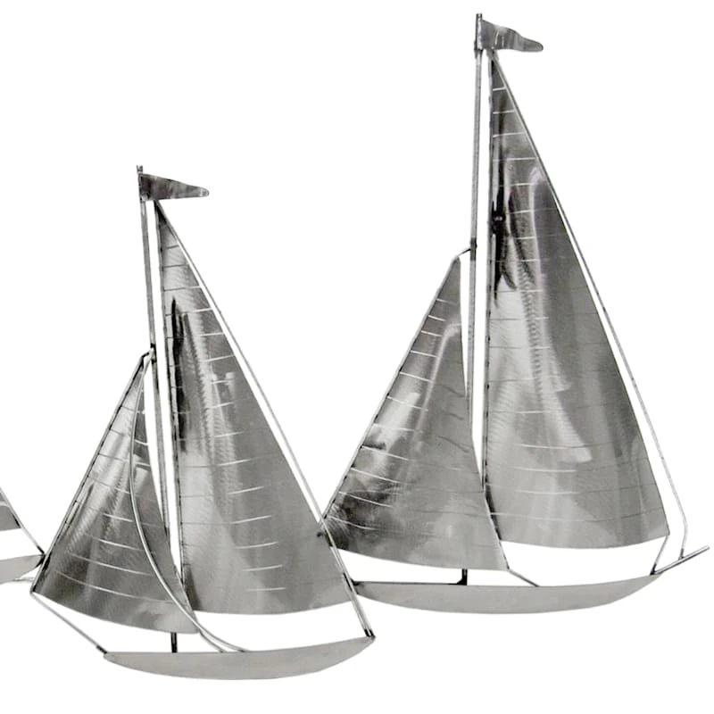 Add a pinch of fun to your garden with our 21in. silver metal triple sailboat wall decor. Created with love, this amazing metal wall sculpture features a shiny metallic pieced sailboat motif. Everyone will enjoy the wonderful welcome. Made of rust-resistant metal, this wall art is designed to greet guests all season long.