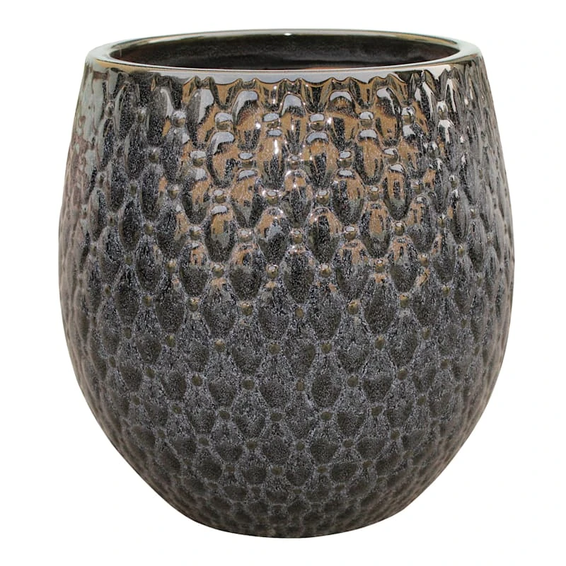 Add a touch of artistic interest to your patio plantings with our 15in. rounded Moonlight black metallic ceramic planter. More than just a spot to display your gardening skills, this wonderful embossed pot creates a striking display with its beautiful chain-link details. Designed to live indoors and out, it’s to make your plants pop.