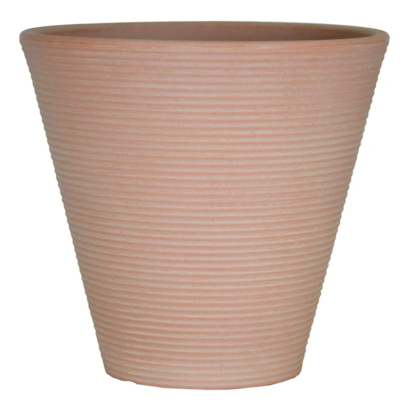 Highlight your green thumb and showcase your annuals and perennials at your front door or add a touch of festive foliage to the deck with our simple yet stylish planter. More than just a spot to display your gardening skills, this wonderful 13in. ribbed cone natural clay-look pot offers a wonderful artistic appearance with its natural hued surface, cone shape and striated stripe motif. Designed to live indoors or on a covered patio, this synthetic planter is ready and waiting to make your plants pop.