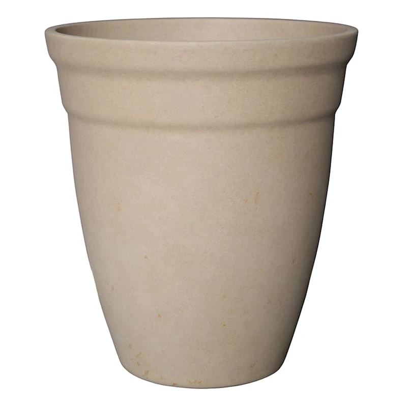 Highlight your green thumb and showcase your annuals and perennials at your front door or add a touch of festive foliage to your deck with our stylish 12in. neutral vintage plastic pot. More than just a spot to display your gardening skills, this flared planter has a sleek appearance with its wonderful bell-shaped design. Created to live indoors or out, it’s ready to make your plants pop.