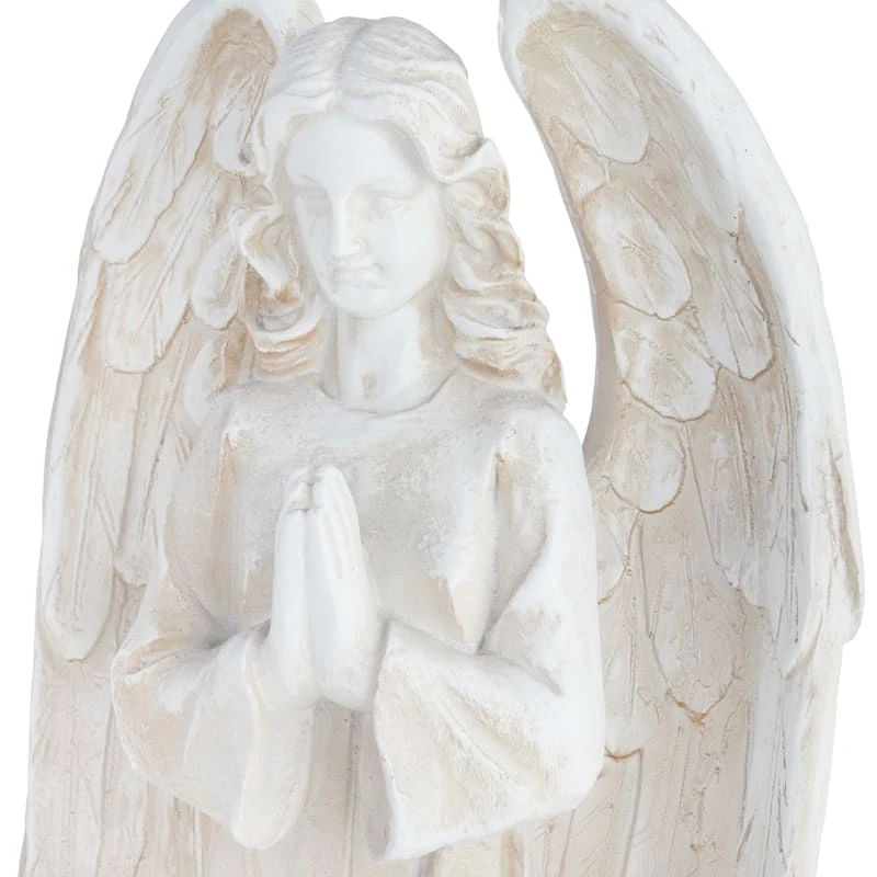 Our angel garden statue will invite peace and tranquility to your outdoor or indoor spaces all year long. Finished with an aged white stone patina, the 32in. resin winged angel sculpture features a beautifully detailed design that will bring calm to your home.