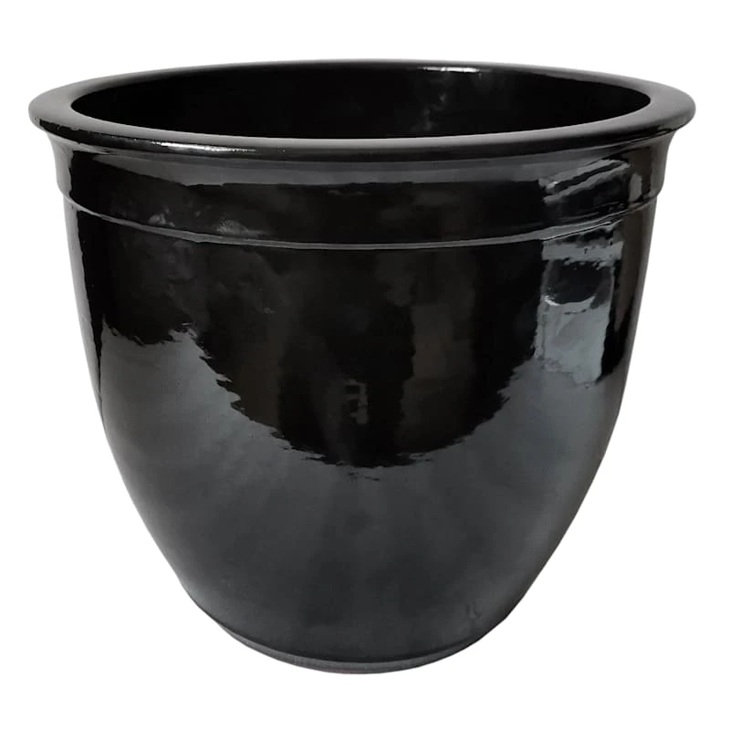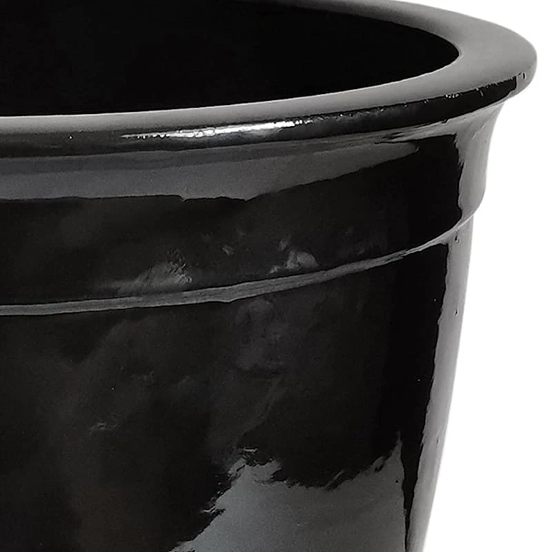 Highlight your green thumb and showcase your annuals and perennials at your front door or add a touch of festive foliage to the deck with our simple yet stylish concrete pot. More than just a spot to display your gardening skills, this wonderful 12in. black Primo planter offers a sleek contemporary appearance with its solid black design and rimmed curvy shape. Designed to live indoors or on a covered patio, this shiny black ceramic pot is ready and waiting to make your plants pop.