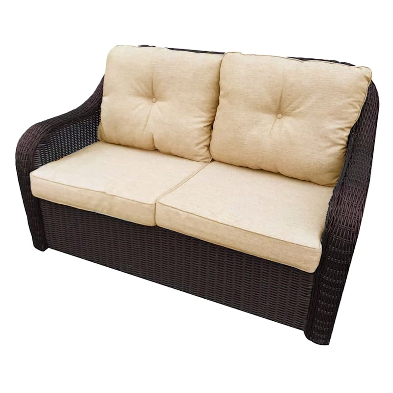 Give your family and friends a reason to look forward to a relaxing visit with our Glendale wicker loveseat. Its fresh neutral cushions are a wonderful contrast to the dark brown synthetic wicker finish. Simple and traditional, it will make a statement in a sunroom or on any outdoor patio or deck.