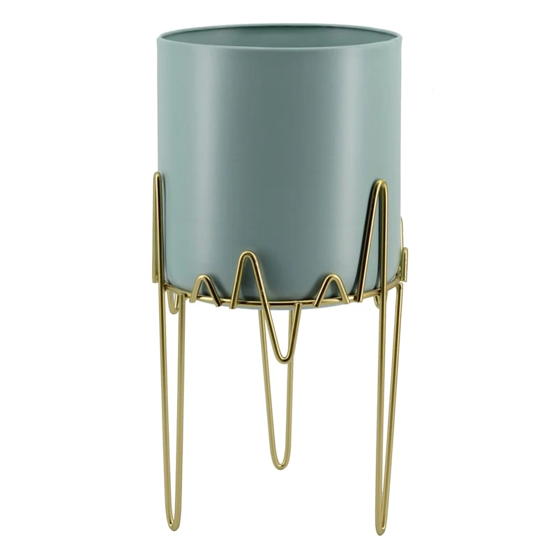 Sand Teal 8" Planter On Gold Metal Deco Plant Stand, 15"