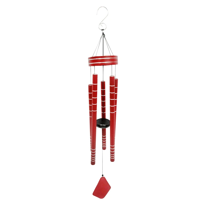 Etched silver and red tubes adorn our tiered metal wind chime, which creates a clear and graceful sound. Wind chimes are symbolic of serenity and tranquility and are also thought to bring luck to whomever listens to them. The perfect gift for the outdoor lover.