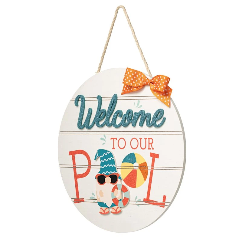 Add a pinch of fun to your garden with our 16in. Sunny Club glittered “Welcome to our Pool” wooden wall sign. Created with love, this simple wood plaque features a fun summer gnome motif. Everyone will enjoy the sweet welcome. Made of slatted wood, this wall art is designed to greet guests all season long.