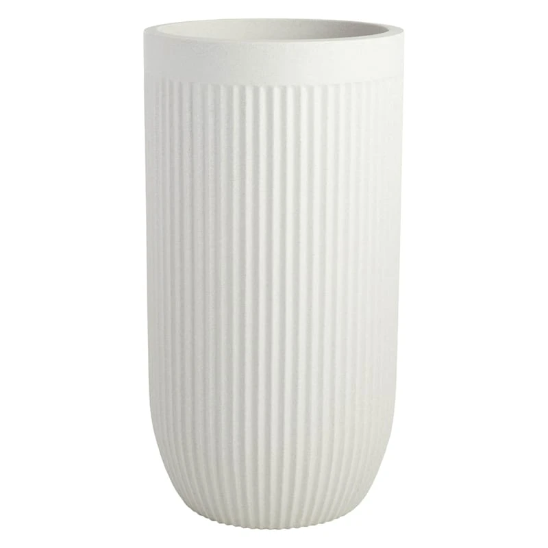 Add a touch of artistic interest to your patio plantings with our 33in. tall fluted synthetic pot. More than just a spot to display your gardening skills, this wonderful off white planter has a sleek stone-like appearance with its straight shape and contemporary ribbed surface. Designed to live indoors and out, it’s ready to make your plants pop.