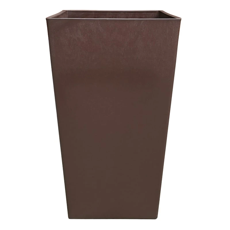 Highlight your green thumb and showcase your annuals and perennials at your front door or add a touch of festive foliage to the deck with our simple yet stylish planter. More than just a spot to display your gardening skills, this wonderful 21in. tall square smooth brown planter offers a wonderful artistic appearance with its simple solid surface and rimmed top. Designed to live indoors or on a covered patio, this plastic pot is ready and waiting to make your plants pop.