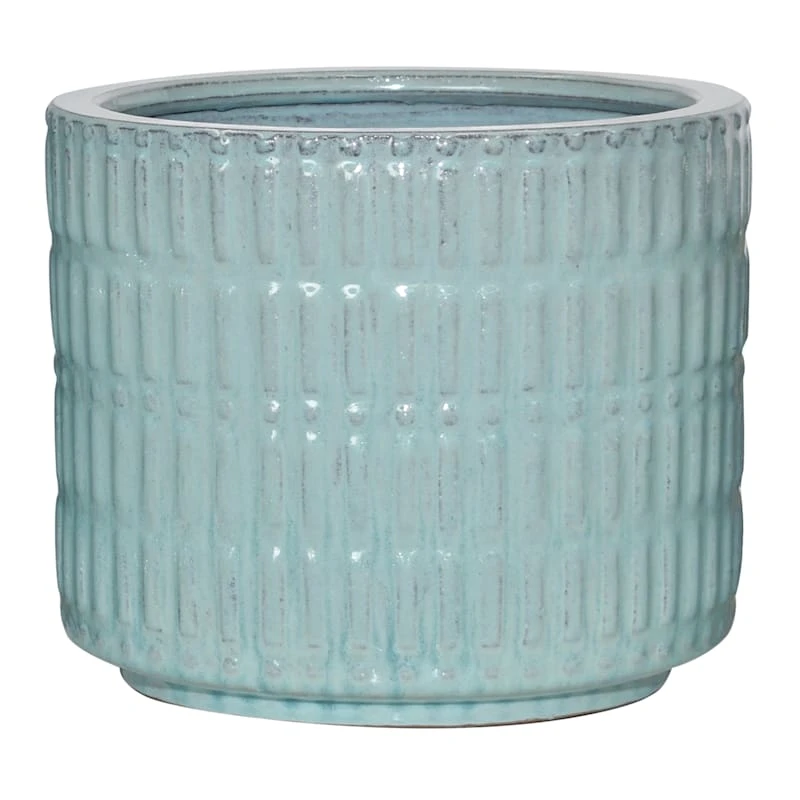 Highlight your green thumb and showcase your annuals and perennials at your front door or add a touch of festive foliage to the deck with our simple yet stylish planter. More than just a spot to display your gardening skills, this wonderful 10in. textured teal ceramic pot offers a wonderful artistic appearance with its traditional cylindrical body and separated stripe surface. Designed to live indoors or on a covered patio, this glazed ceramic planter is ready and waiting to make your plants pop.