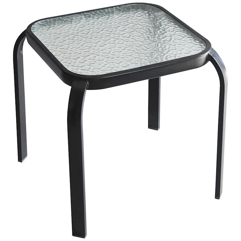 Streamlined with just a touch of retro, our black steel outdoor patio end table exudes simple contemporary design. Crafted of painted metal with a weatherproof finish and tempered glass, this side table strikes a clean-lined square silhouette on four straight legs. Rounding out the design, the versatile color! This table provides a perfect platform for drinks and nibbles at your next backyard bash.
