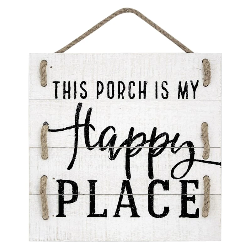 Add a pinch of fun to your garden with our 12in. black and white “this porch is my Happy Place” wooden pallet wall sign. Created with love, this simple wood plaque features a fun summer message motif. Everyone will enjoy the sweet welcome. Made of slatted wood and rope, this wall art is designed to greet guests all season long.