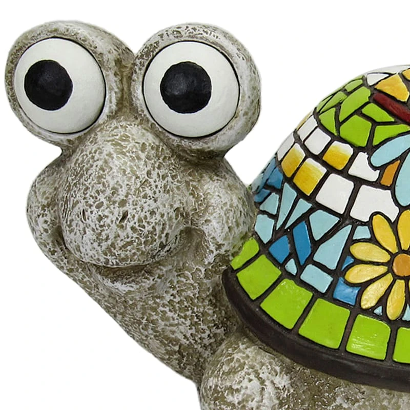 Our colorful 11in. mosaic shell turtle garden statue is the perfect garden decoration for landscape lovers. This fun resin outdoor decor piece features a whimsical turtle with glow in the dark eyes ready to stand guard in your garden. With the playful details, this figurine adds a touch of personality to any outdoor space.