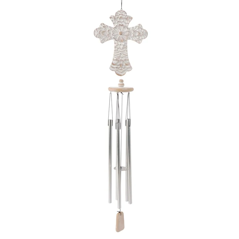 Featuring a silver tubular silhouette, our 21in. tiered metal and weathered resin carved cross wind chimes create a clear and graceful sound. Wind chimes are symbolic of serenity and tranquility and are also thought to bring luck to whomever listens to them. The perfect gift for the outdoor lover.