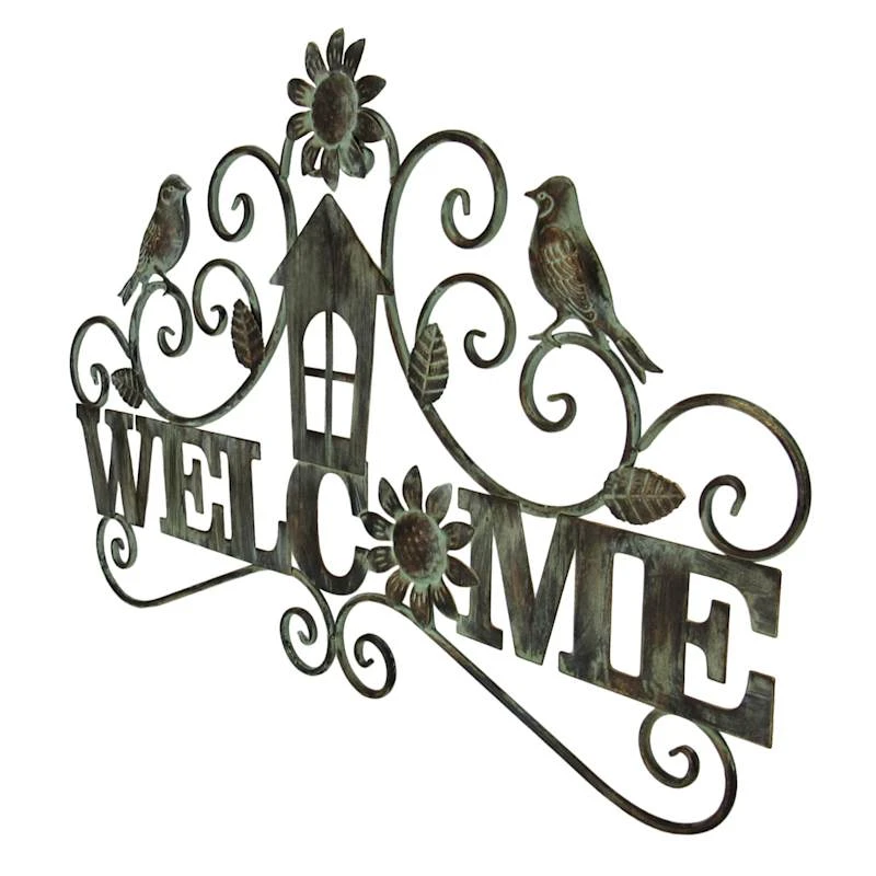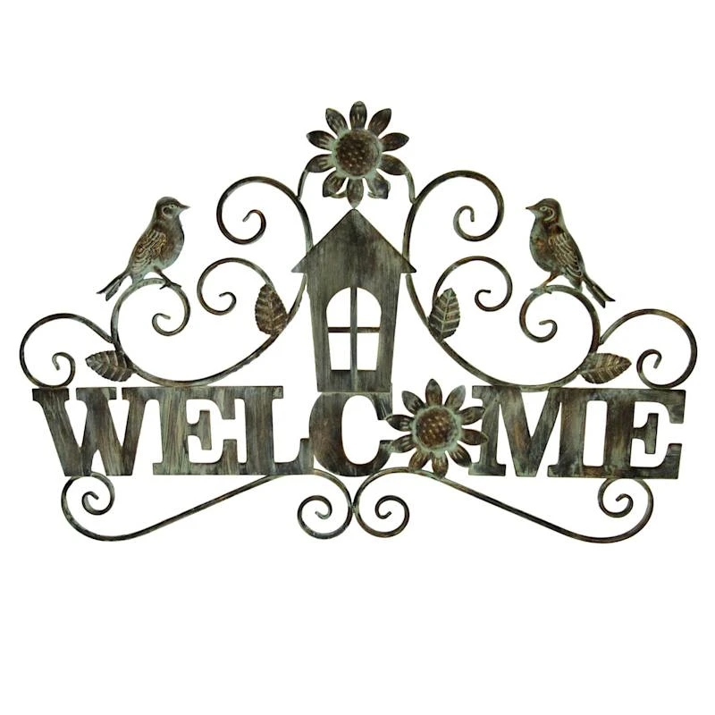 Add a pinch of fun to your garden with our 28in. “Welcome” birds wall sign. Created with love, this simple plaque features a natural metal flower, bird and scroll motif. Everyone will enjoy the sweet welcome. Made of rust-resistant metal with a rope hanger, this wall decor is designed to greet guests all season long.