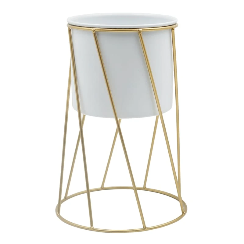 Give your plants a fun, cheery spot in which to hang out with our gold metal plant stand. Featuring a shimmering metallic finish, white metal pot and an angled line silhouette, this modern piece will be right at home inside or on a covered patio. Whether you’re setting up a garden room or simply looking to protect a delicate plant from the harsh outdoors, this stand is a great option for your home.