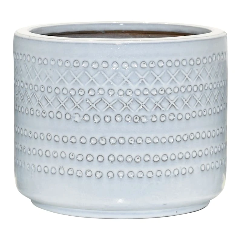 Highlight your green thumb and showcase your annuals and perennials at your front door or add a touch of festive foliage to the deck with our simple yet stylish planter. More than just a spot to display your gardening skills, this wonderful small 7x8in. white tribal ceramic pot offers a wonderful artistic appearance with its dot and X-stripe design and modern cylindrical shape. Designed to live indoors or on a covered patio, this light ceramic planter is ready and waiting to make your plants pop.