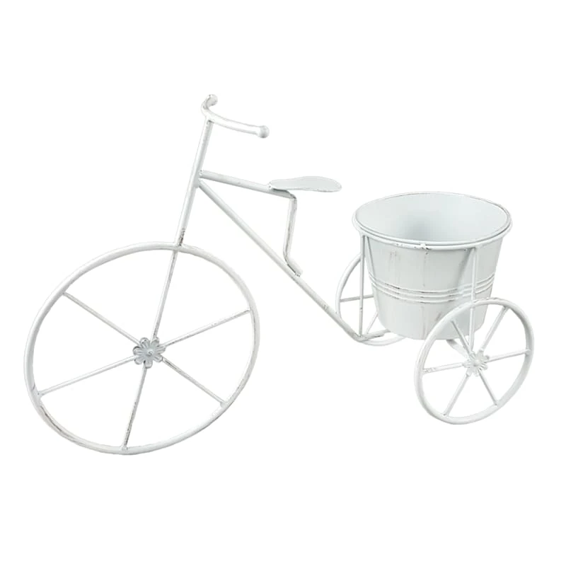 Add a pinch of fun to your garden with our white metal tricycle plant stand. Created with love, this detailed metal piece features a back bucket ready for plants to jump into for a breezy ride. Everyone will enjoy the charming design nestled in your garden. Made of rust-resistant metal.