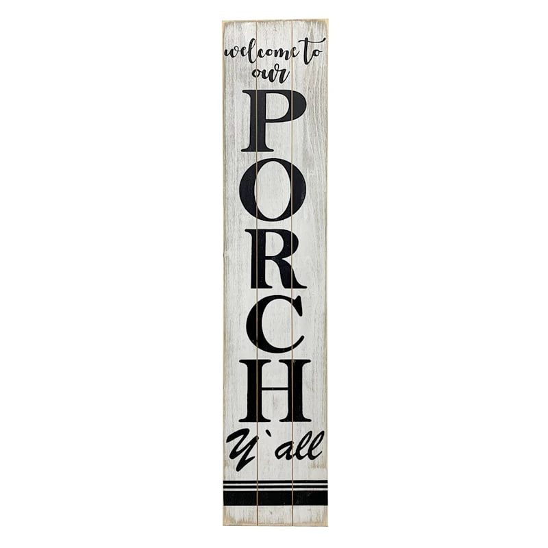 Our charming vertical pallet sign features the message “Welcome to our porch y’all” in black on a rustic antique-white washed barn wood background. This wood and manufactured wood sign has a rustic, distressed finish that gives it authentic antique, old-world charm.