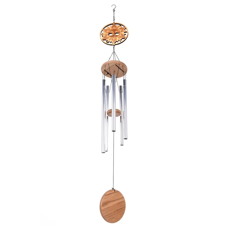 A carved wooden sun face, disc and silver tubes adorn our tiered wood and metal wind chime, which creates a clear and graceful sound. Wind chimes are symbolic of serenity and tranquility and are also thought to bring luck to whomever listens to them. The perfect gift for the outdoor lover.